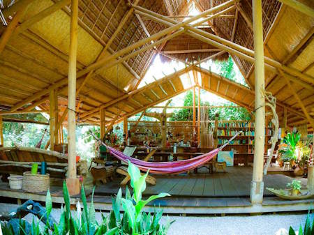 The Lodge also has great places to relax on the beach. Including our hammocks, ocean-tree platform and Yoga Lounge. During the season. (May through December) if you are lucky, you can see turtles nesting and baby turtles hatching. During the day when not out on a tour, enjoying the beach, lazing around the natural river pool or practicing yoga, the ‘Casa Grande’ offers a variety of ways to while away the hours. Folks enjoy the library, socialize with other guests, watch the sights unfold in the open air kitchen, play a game of chess or a bit of music, read up on the rain forest, and when needed, check in with planet earth on our free WiFi service, (may be "sporadic" at times).